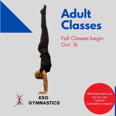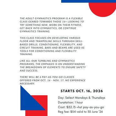 The Adult Gymnastics class is a flexible class geared towards those 18+ looking to try something new, work on their fitness, get back into gymnastics or continue gymnastics training. This class focuses on developing various floor and trampoline skills through skill-based drills, conditioning, flexibility and circuit training. Bars and beams are used as tools for conditioning and flexibility training. Like all our tumbling and gymnastics programs the emphasis is on understanding the breakdown of elements to ensure safety and success. NO EXPERIENCE NECESSARY